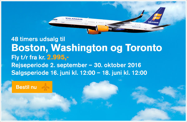 Icelandair kører nemlig en kampagne fra Danmark til Boston, Washington DC og Toronto, hvor du kan flyve t/r for kun kr. 2.995,-