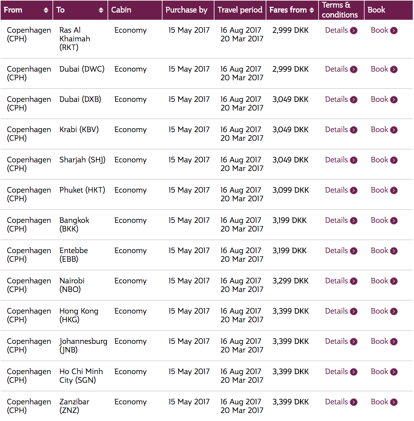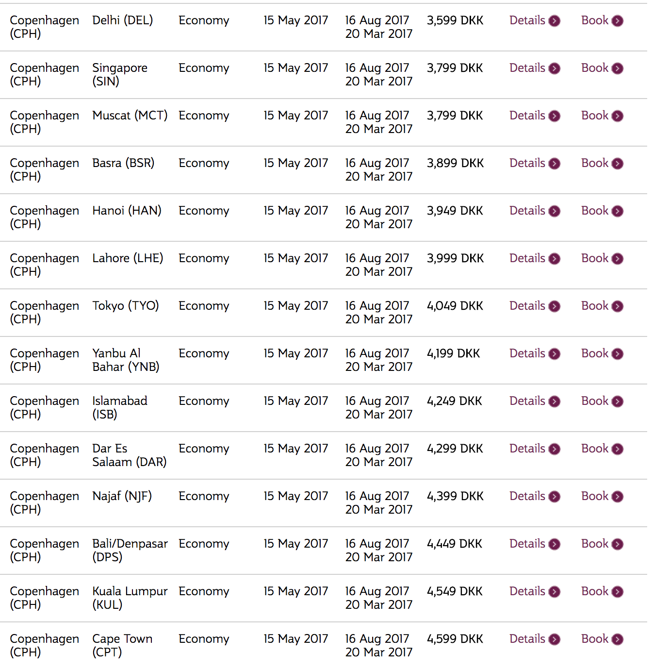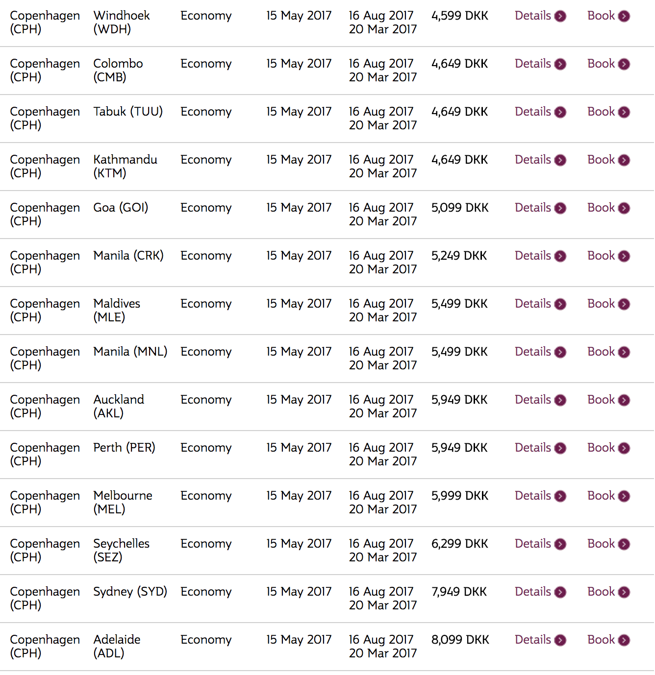 Her ser du en oversigt over startpriserne til de mange desinationer, som Qatar Airways har på tilbud lige nu: