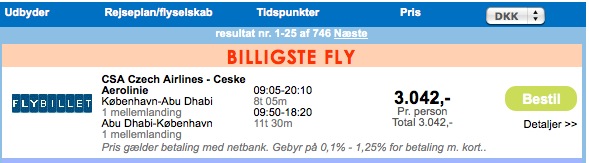 Blandt andet er det muligt at finde disse laver priser i efterårsferien, hvor mange danskere typisk rejser væk for at få lidt varme. Ovenfor er vist en billet med Czech Airlines til Abu Dhabi d. 12. oktober og retur d. 25. oktober 2011 (fundet d. 31. august 2011)