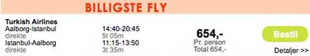 Her på Rejsesøgemaskinen Viviro.com har vi tjekket priserne på ruten fra Aalborg til Istanbul og her starter billetprisen ved sølle kr. 654,- inkl. skatter og afgifter. Denne pris gælder endda for tur-retur – og altså ikke blot one-way billet, som lavprisselskaberne typisk reklamerer med – og samme pris gælder hvis du vil flyve fra Billund.