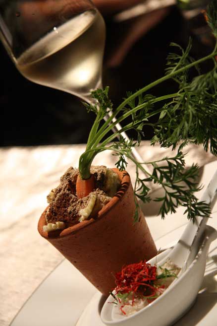 Tag billedet til højre, der viser “The Harvest” – høsten – som er nummer seks i rækken af retter. I urtepotten gemmer sig en "mousse af grøn karry" og på skeen foran ligger en "tatar af kammusling med citrongræs".